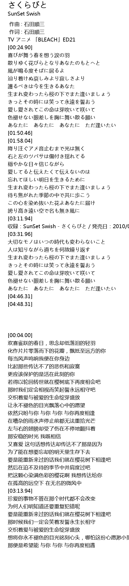 | [03:13.94] | 収録:SunSet Swish - さくらびと/発売日:2010/01/13 |
