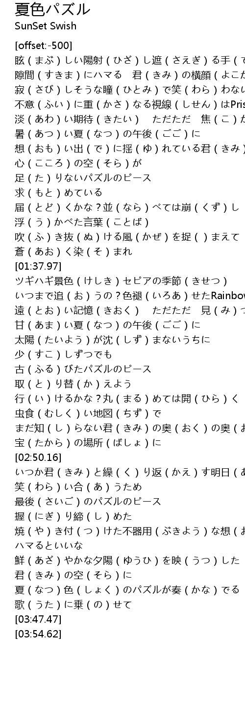 | [03:38.00] | 夏(なつ)色(しょく)のパズルが奏(かな)でる |