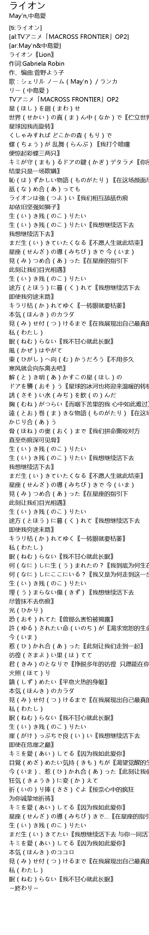| [00:51.820] | 舐(な)め合(あ)っても ライオンは強(つよ)い〖我们相互舔舐伤痕 却依旧坚强如狮子〗 |