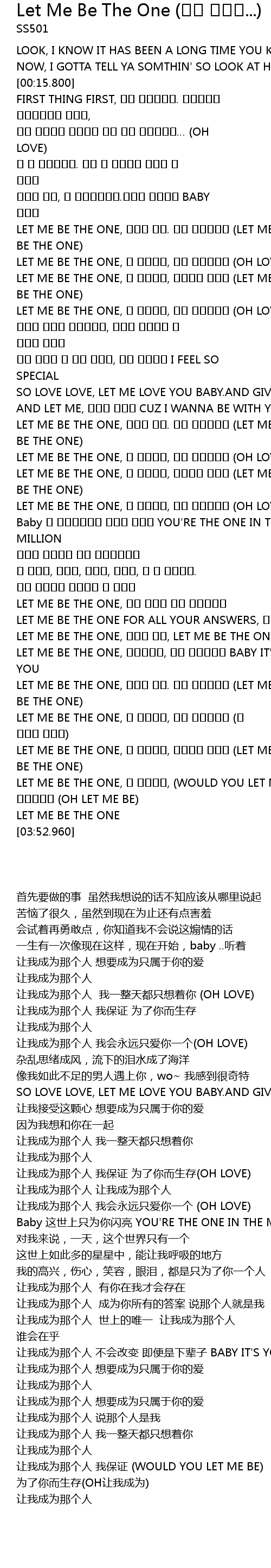 | [03:33.600] | LET ME BE THE ONE, 나 영원토록, (WOULD YOU LET ME BE) 너만 사랑한다고 (OH LET ME BE) |