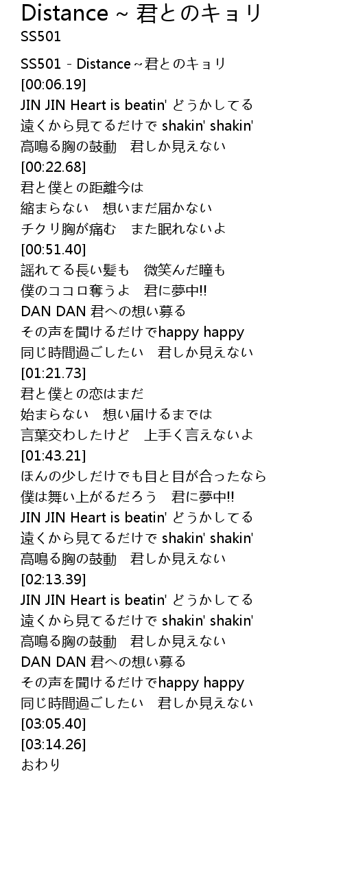 | [00:00.00] | SS501 - Distance~君とのキョリ |