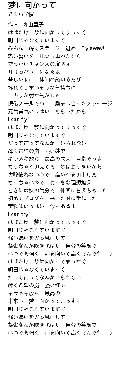 | いつでも强く 前を向いて高く飞んで行こう | |