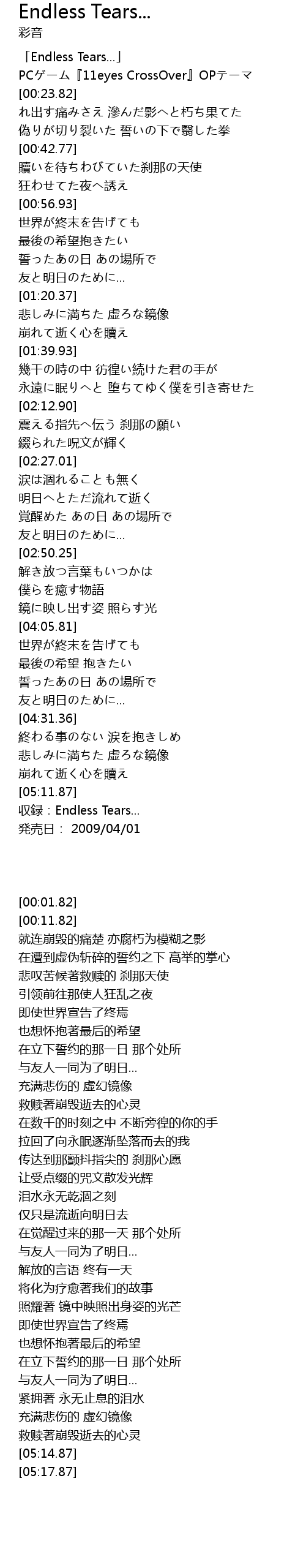 | [04:34.22] | 終わる事のない 涙を抱きしめ |
