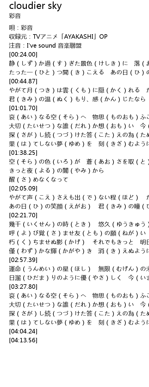 | [00:16.00] | 収録元:TVアニメ「AYAKASHI」OP |