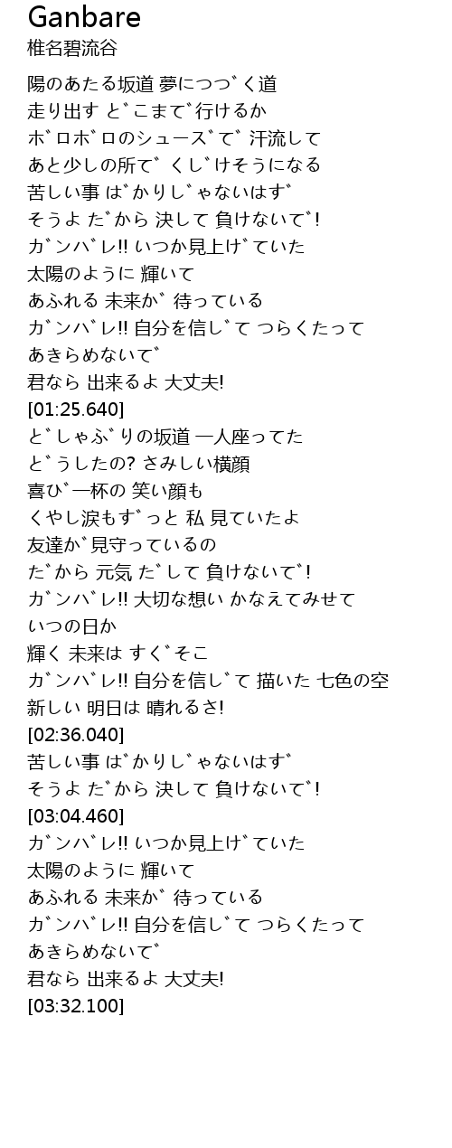 | [01:13.330] | ガンバレ!! 自分を信じて つらくたって あきらめないで |