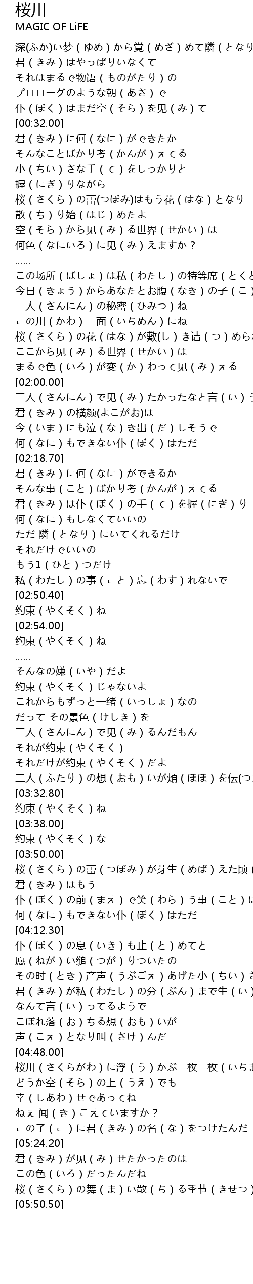 | [00:50.00] | 桜(さくら)の蕾(つぼみ)はもう花(はな)となり |