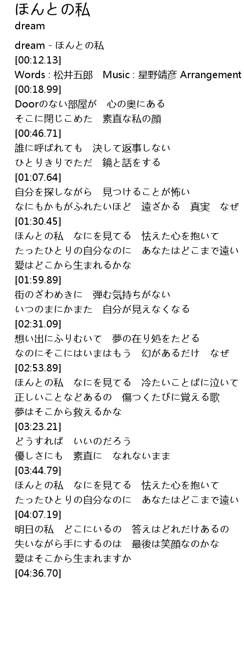 | [03:46.27] | ほんとの私 なにを見てる 怯えた心を抱いて |