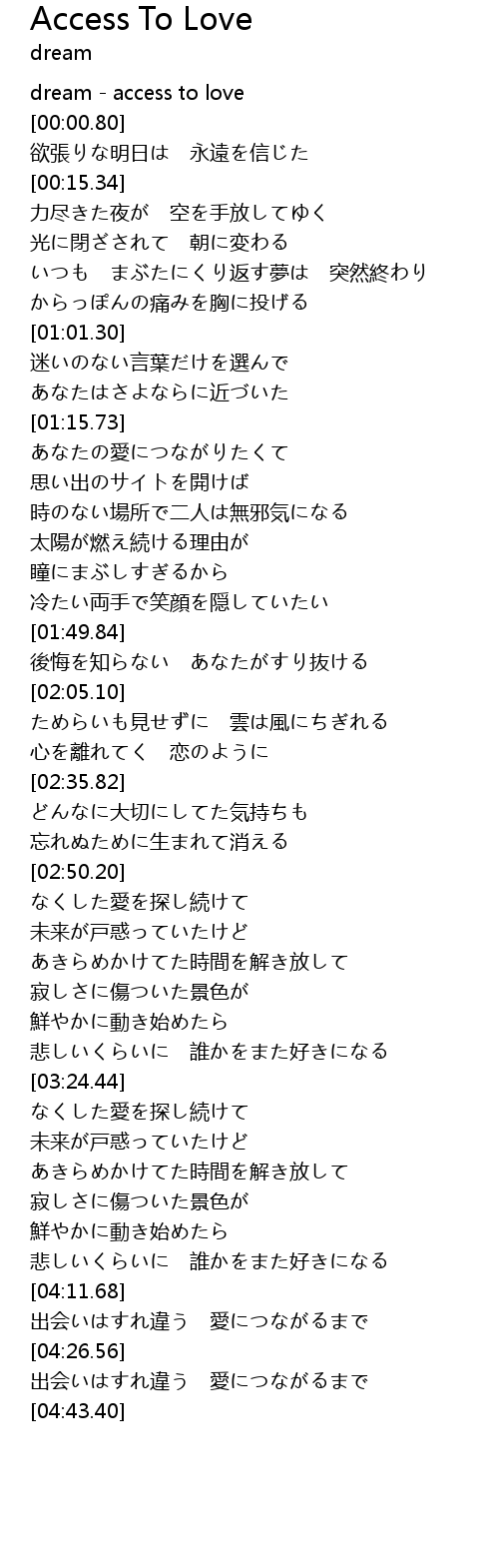 | [04:11.91] | 出会いはすれ違う 愛につながるまで |