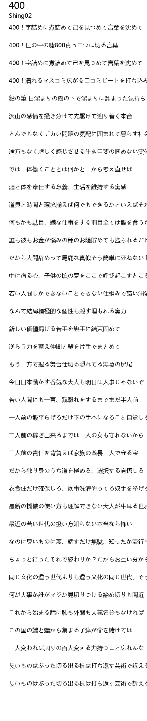| 400!字詰めに煮詰めて己を見つめて言葉を沈めて | |