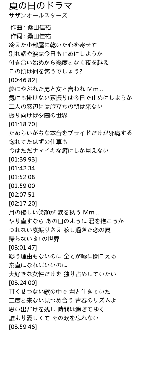 | [00:01.00] | 作词 : 桑田佳祐 |