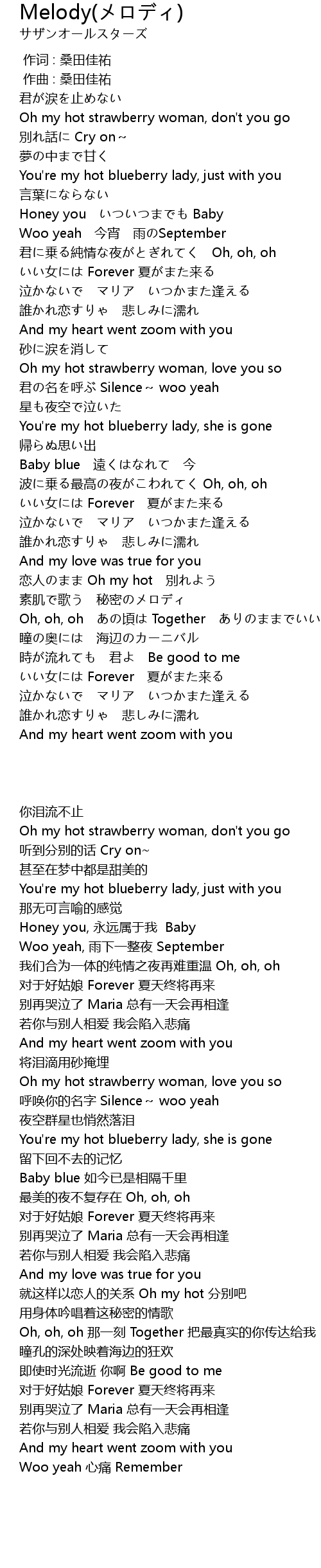 | [00:12.650] | Oh my hot strawberry woman, don' t you go |