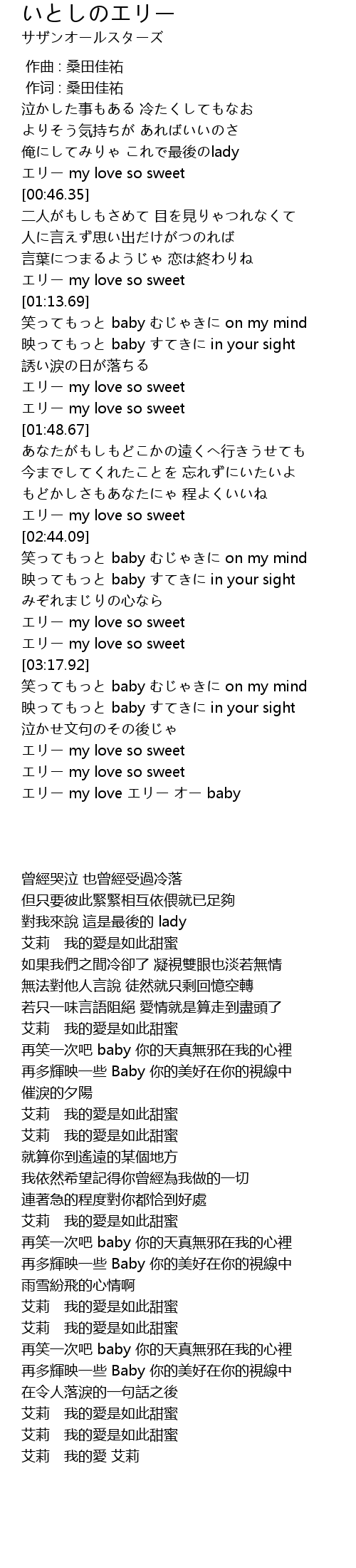| [00:01.00] | 作词 : 桑田佳祐 |