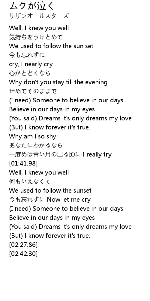 | [02:02.46] | 今も忘れずに Now let me cry |