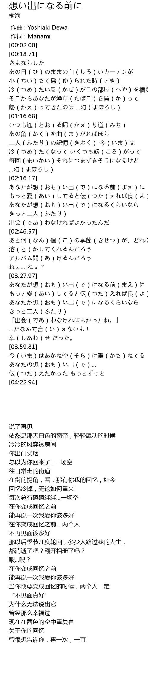 | [02:16.80] | あなたが想(おも)い出(で)になる前(まえ)に |