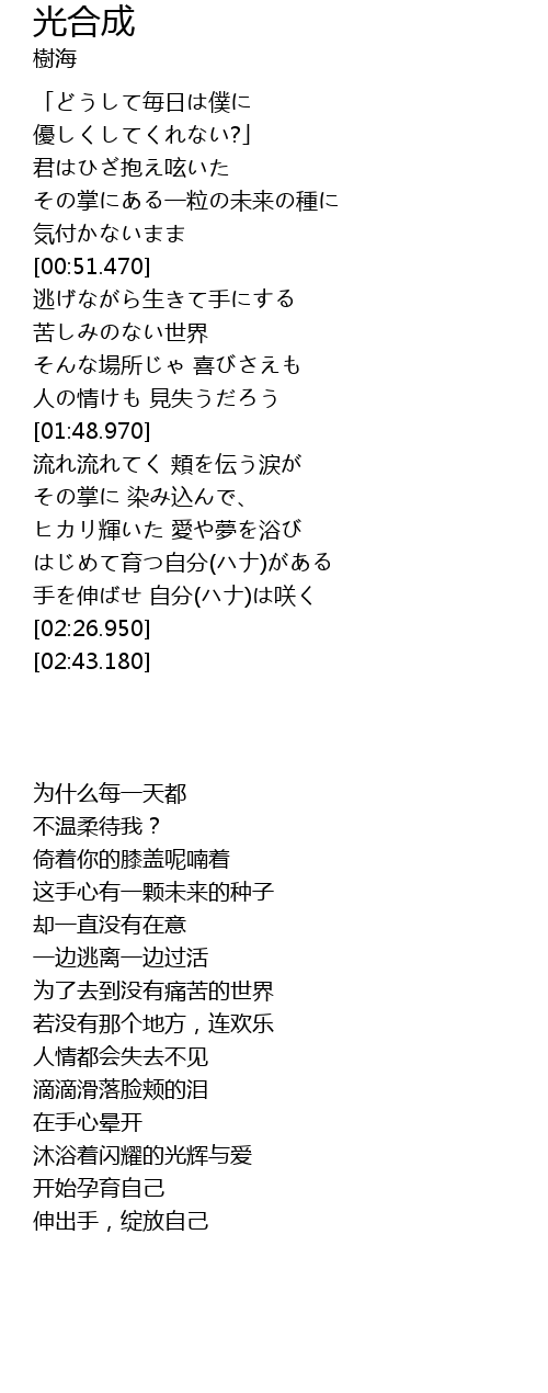 | [02:18.370] | 手を伸ばせ 自分(ハナ)は咲く |