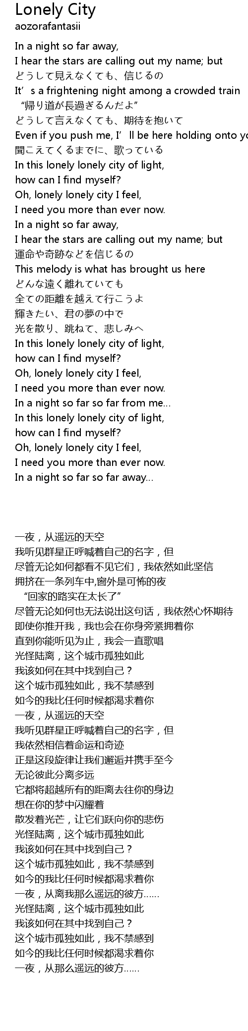 | [03:30.000] | Oh, lonely lonely city I feel, |