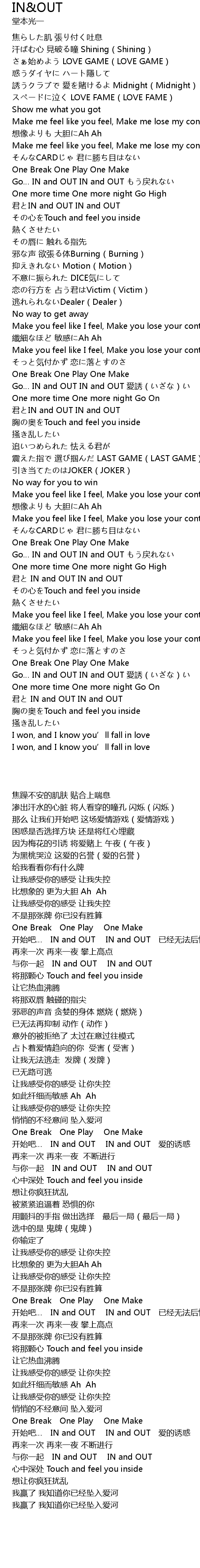 | [01:08.72] | Go… IN and OUT IN and OUT もう戻れない |