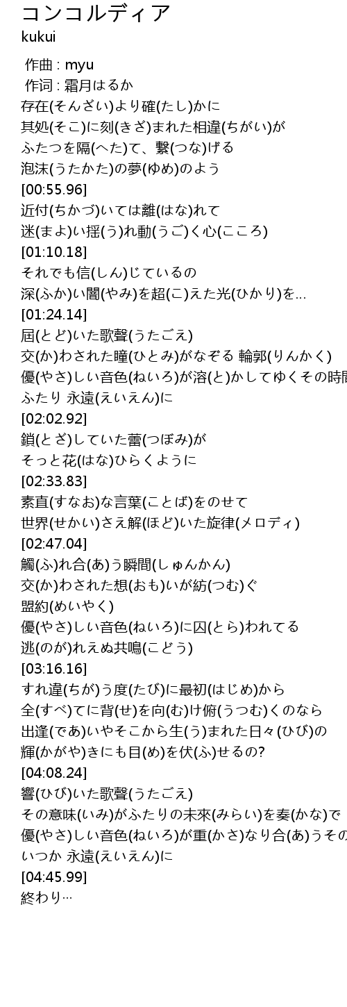 | [04:12.91] | その意味(いみ)がふたりの未來(みらい)を奏(かな)で |