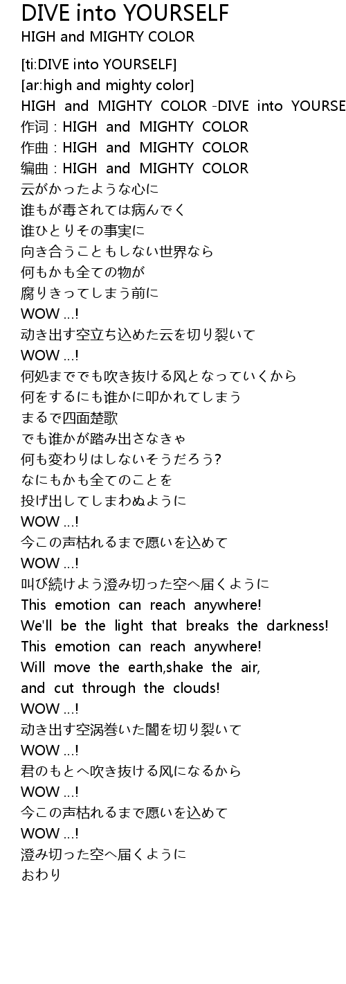 | [00:01.92] | HIGH and MIGHTY COLOR DIVE into YOURSELF |