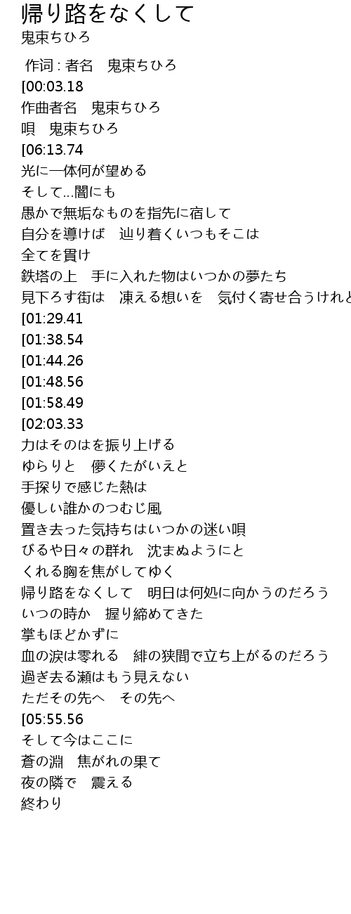 | [03:07.66] | 帰り路をなくして 明日は何処に向かうのだろう |