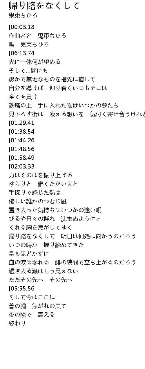 | [03:07.66] | 帰り路をなくして 明日は何処に向かうのだろう |