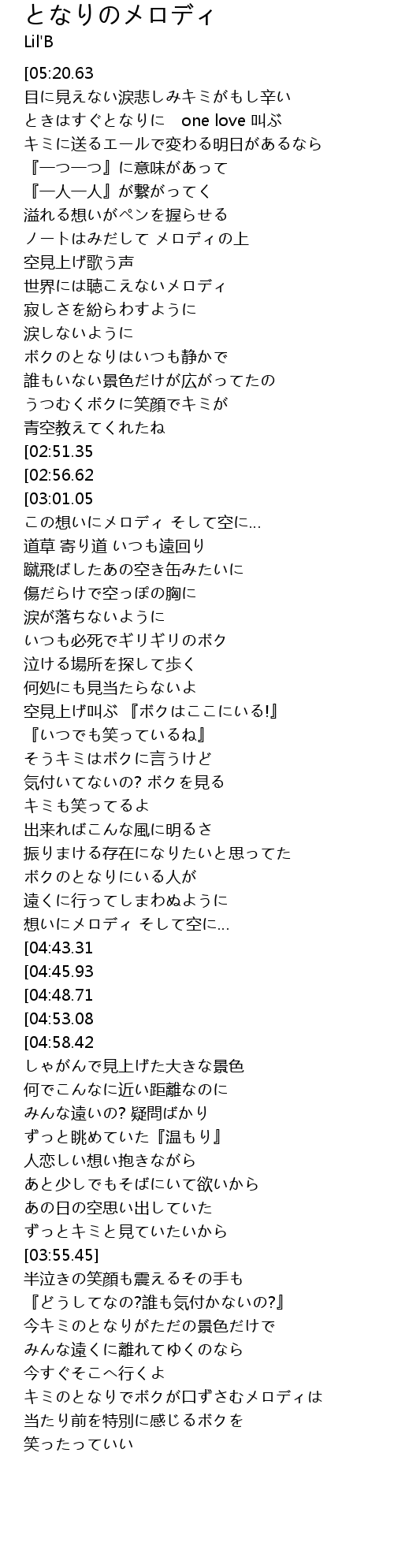 | [00:25.64] | ときはすぐとなりに one love 叫ぶ |