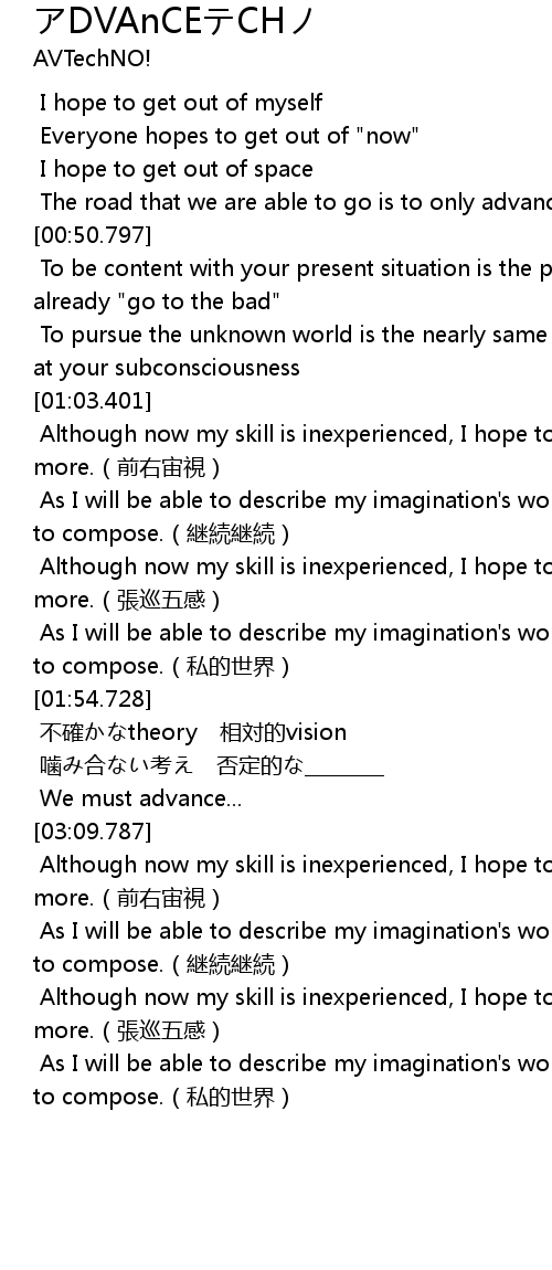 | [03:25.312] | As I will be able to describe my imagination's world... I continue to compose.(継続継続) |