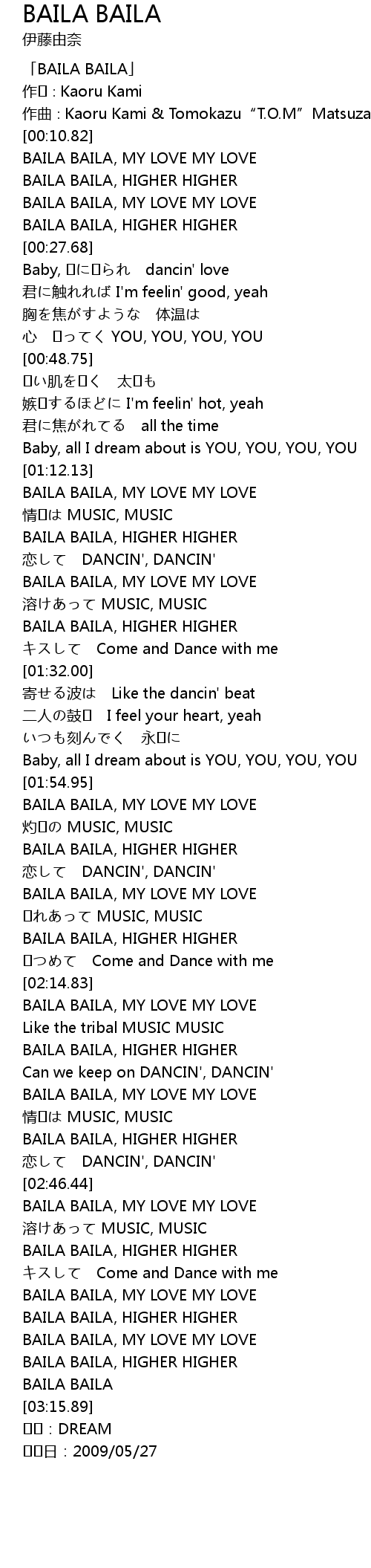 | [01:59.93] | BAILA BAILA, HIGHER HIGHER |