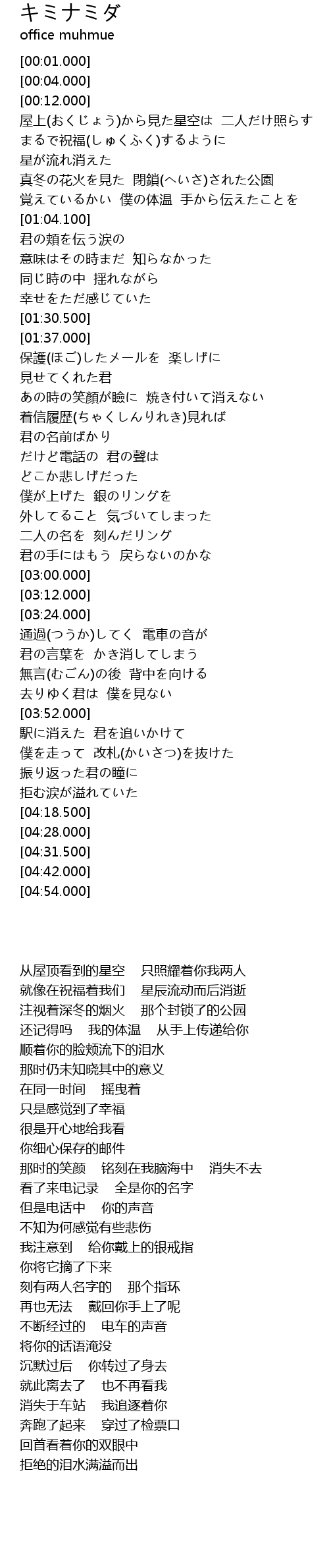 | [03:59.000] | 僕を走って 改札(かいさつ)を抜けた |