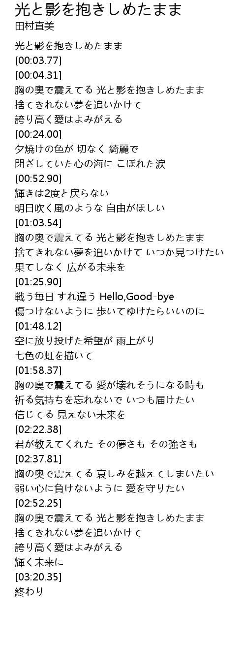 | [02:53.16] | 胸の奥で震えてる 光と影を抱きしめたまま |