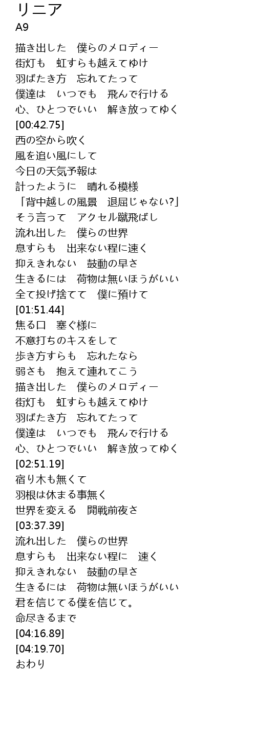 | [02:42.76] | 心、ひとつでいい 解き放ってゆく |
