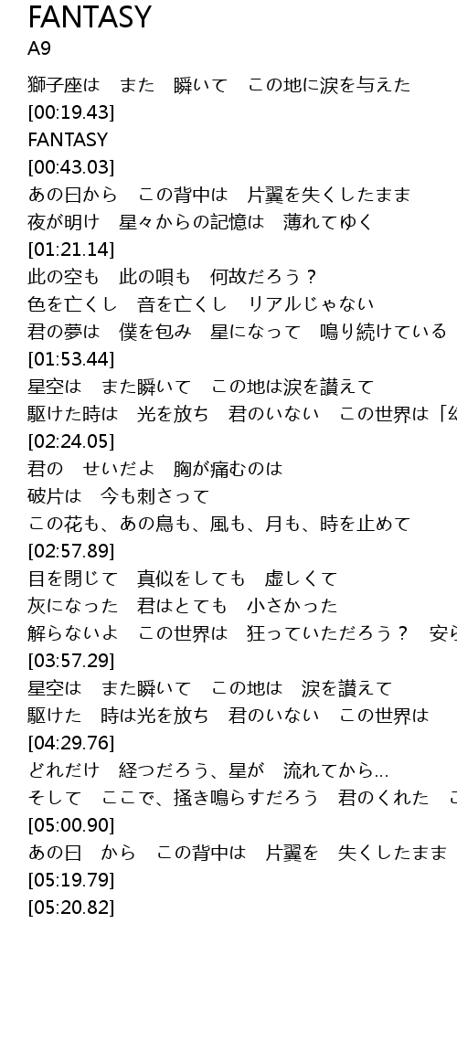 | [02:09.25] | 駆けた時は 光を放ち 君のいない この世界は「幻想」 |