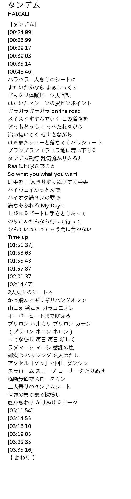 | [03:33.15][03:22.35] | 感覚タンデム中(まだまだ) |