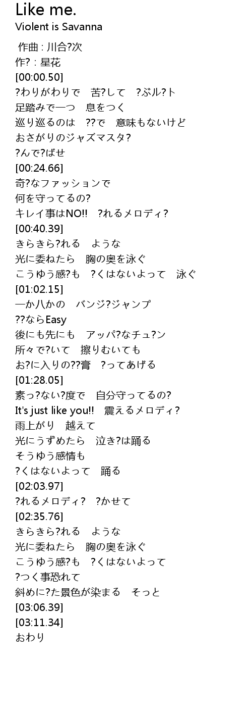 | [02:26.30] | ?れるメロディ? ?かせて |