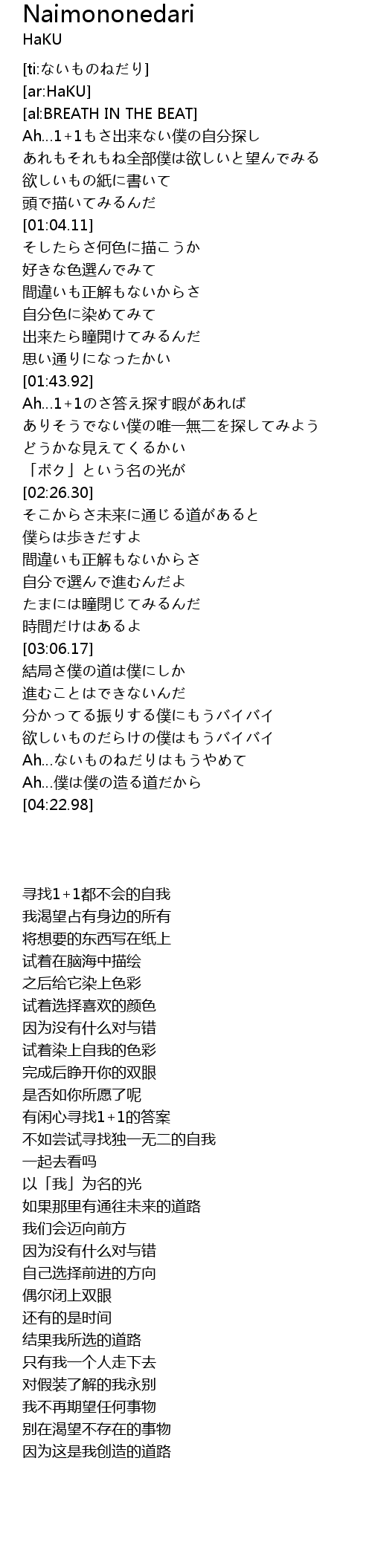 | [01:59.52] | Ah…1+1のさ答え探す暇があれば |