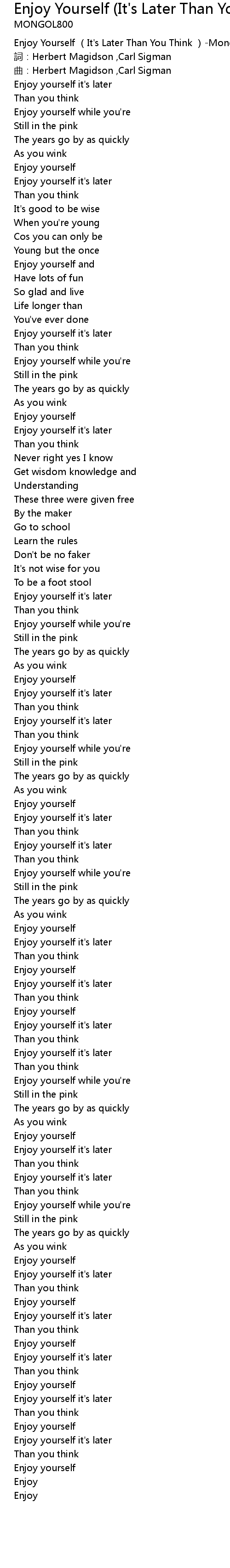 | [00:00.00] | Enjoy Yourself It' s Later Than You Think Mongol800 |