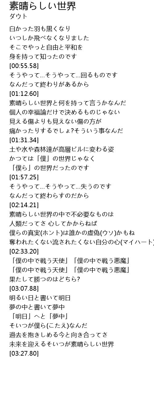 | [01:13.01] | 素晴らしい世界と何を持って言うかなんだ |