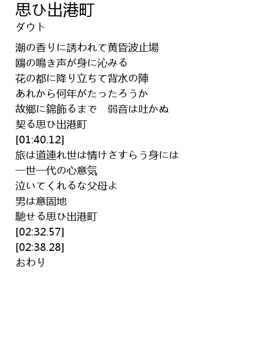 | [00:31.02] | 潮の香りに誘われて黄昏波止場 |
