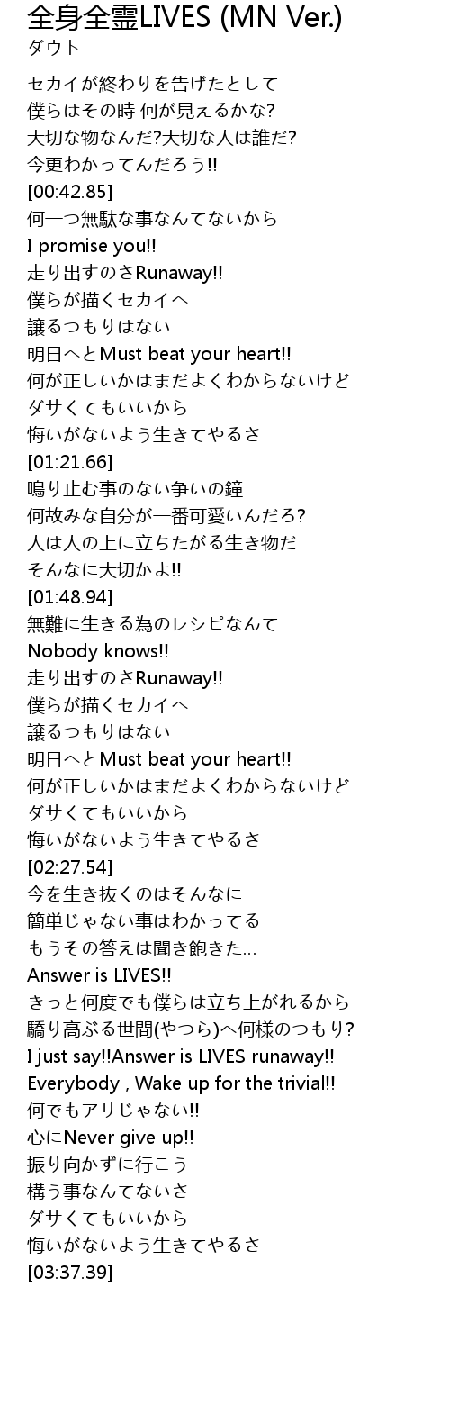 | [03:09.51] | I just say!! Answer is LIVES runaway!! |