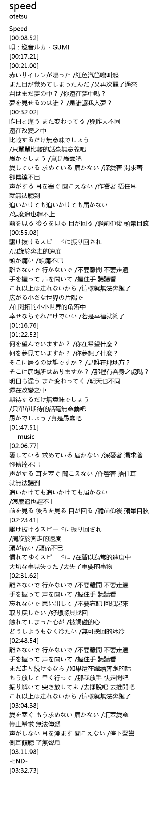 | [00:55.58] | 駆け抜けるスピードに振り回され /周旋於奔走的速度 |