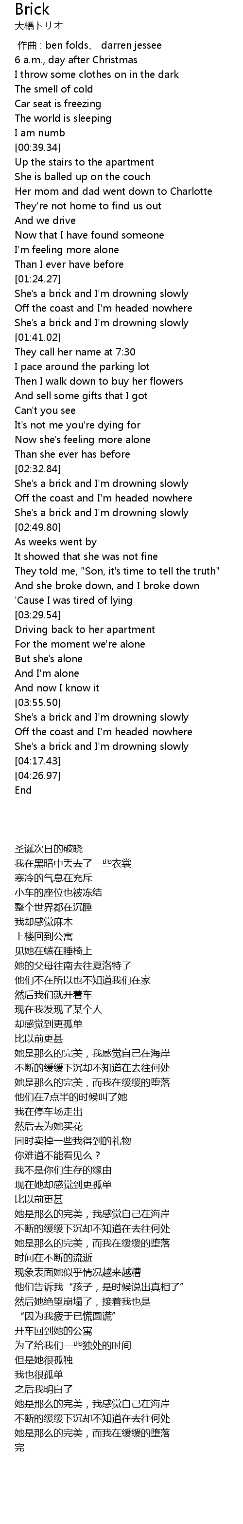 | [04:09.51] | She's a brick and I'm drowning slowly |
