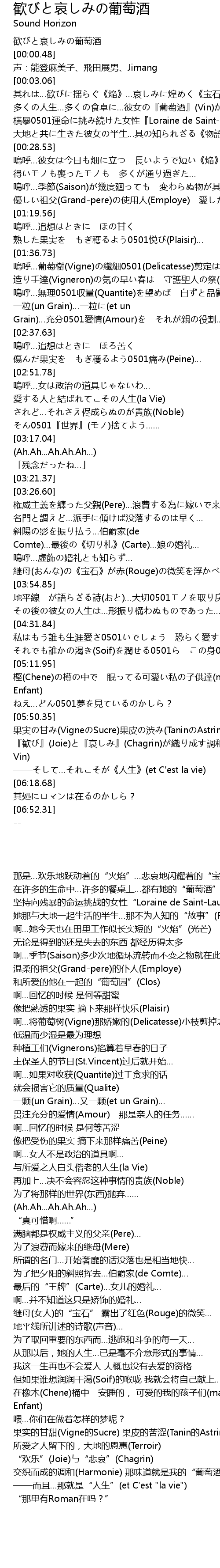 | [06:03.06] | 『歓び』(Joie)と『哀しみ』(Chagrin)が織り成す調和(Harmonie) その味わいが私の『葡萄酒』(ma Vin) |
