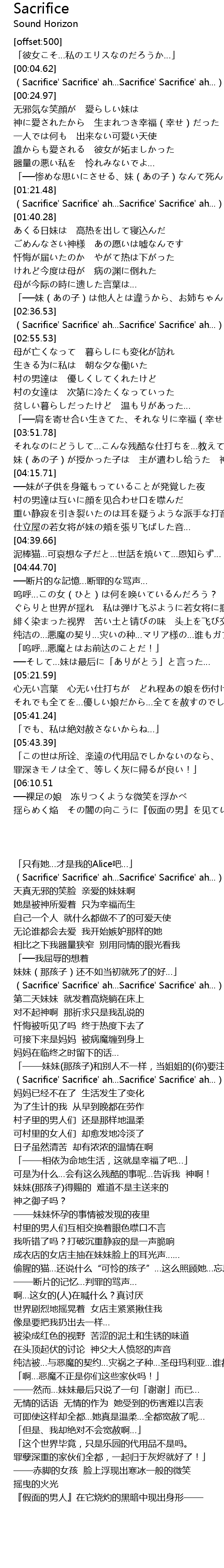 | [00:07.19] | Sacrifice' Sacrifice' ah... Sacrifice' Sacrifice' ah... |