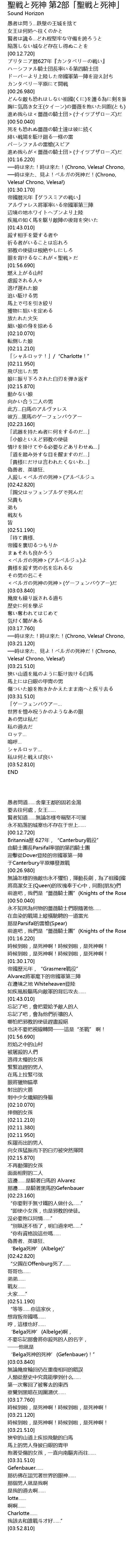 | [03:21.300] | ──時は來た、見よ!ベルガの死神だ!(Chrono, Velesa! Chrono, Velesa!) |