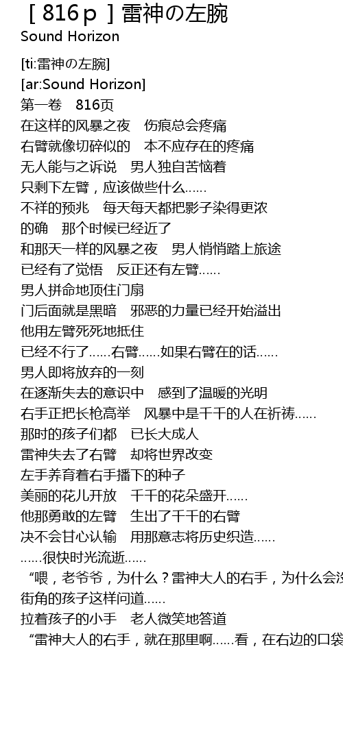 | [01:57.898] | “喂,老爷爷,为什么?雷神大人的右手,为什么会没了呢?多可怜啊……” |