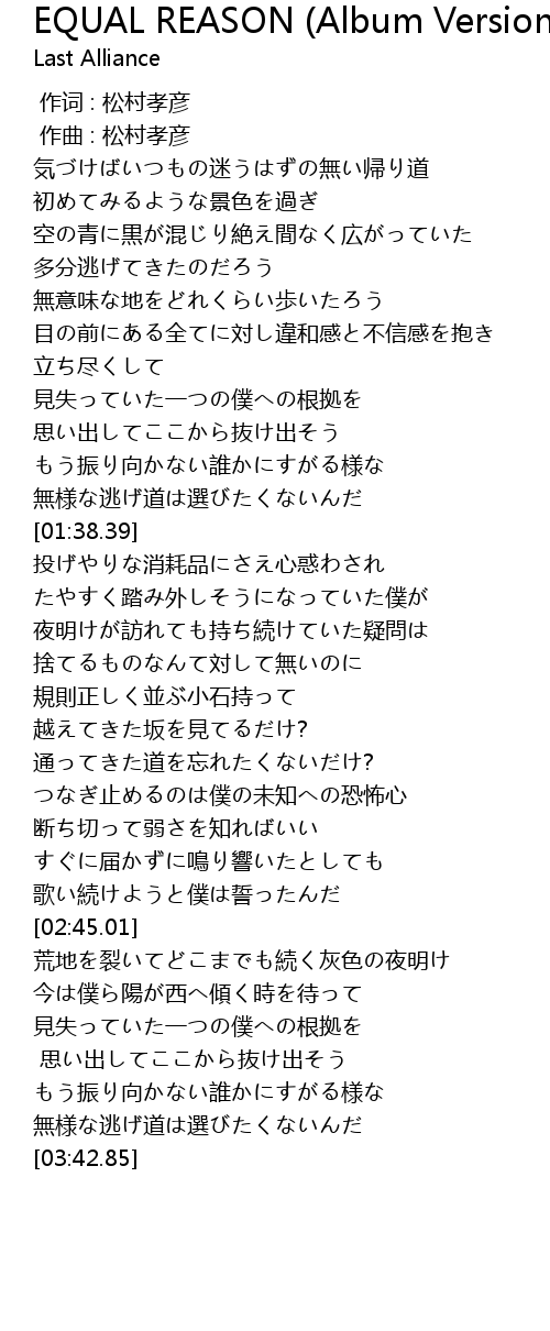 | [00:56.65] | 多分逃げてきたのだろう 無意味な地をどれくらい歩いたろう |
