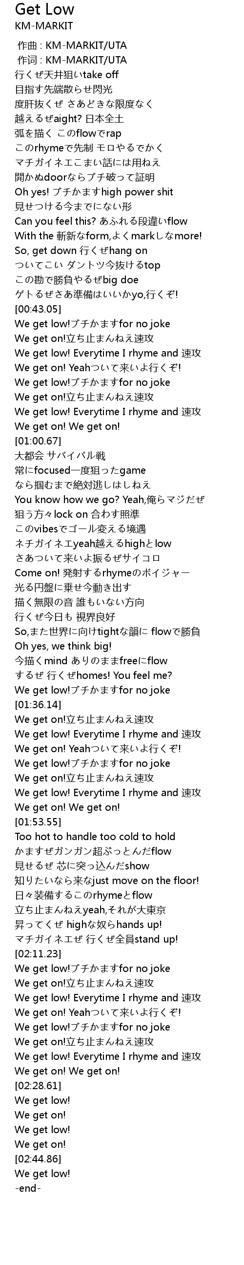 | [00:43.29] | We get low!ブチかますfor no joke |