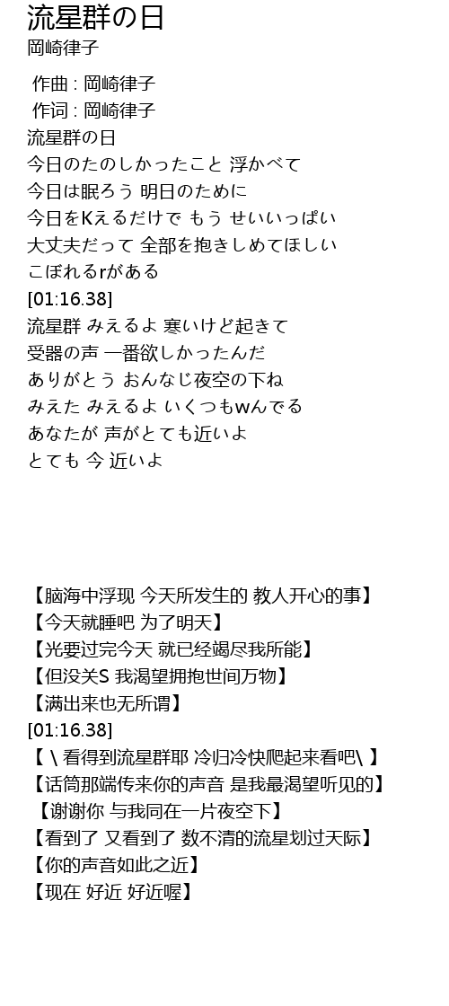 | [01:35.04] | 流星群 みえるよ 寒いけど起きて |