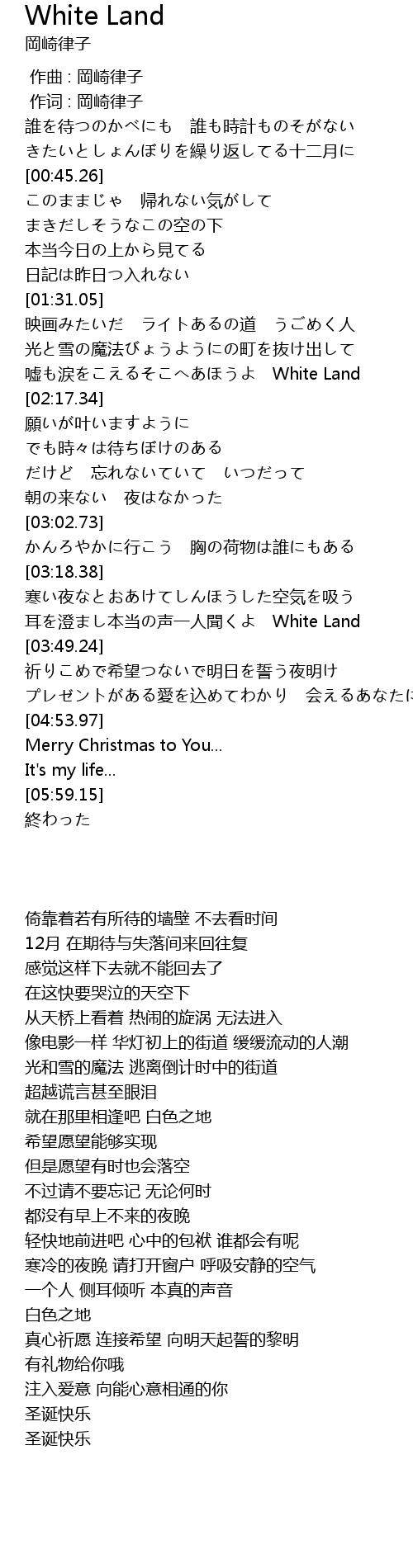 | [03:36.13] | 耳を澄まし本当の声一人聞くよ White Land |