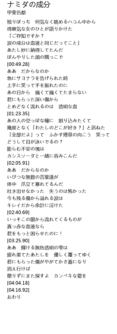 | [00:31.55] | 涙の成分は血液と同じだってこと」 |